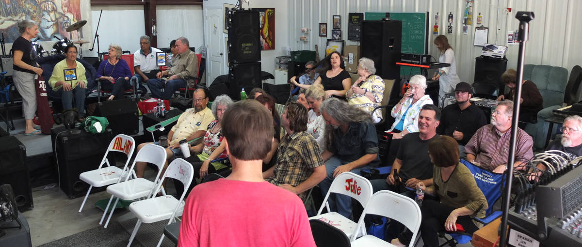 preview was held at Jason Marion’s business, The Audio Dojo, in Wimberley. This is a rehearsal space featuring state-of-the-art sound reinforcement facilities. It also has a projection screen that is 12 feet wide. Notice how no one was willing to sit in the front row. They were spread out along the back and outside of the photo.